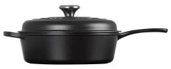De Oldenhof by Chasseur braadpan is vervaardigd uit mat zwart, geëmailleerd gietijzer en heeft tevens een matzwarte binnenzijde. De ronde pan heeft een diameter van 28 cm en een inhoud van 6,1 liter. Hiermee is de pan geschikt voor het maken van gerechten voor 6-8 personen, bijvoorbeeld voor soepen of stoofgerechten. De Chasseur braadpan is geschikt voor gebruik op alle warmtebronnen, inclusief inductie en de oven.